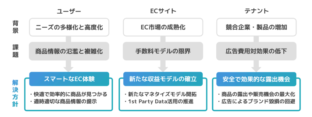 - 【テナント】 購買意欲の高い検索にだけ露出 → 出店者のROI(投資対効果)が上がる