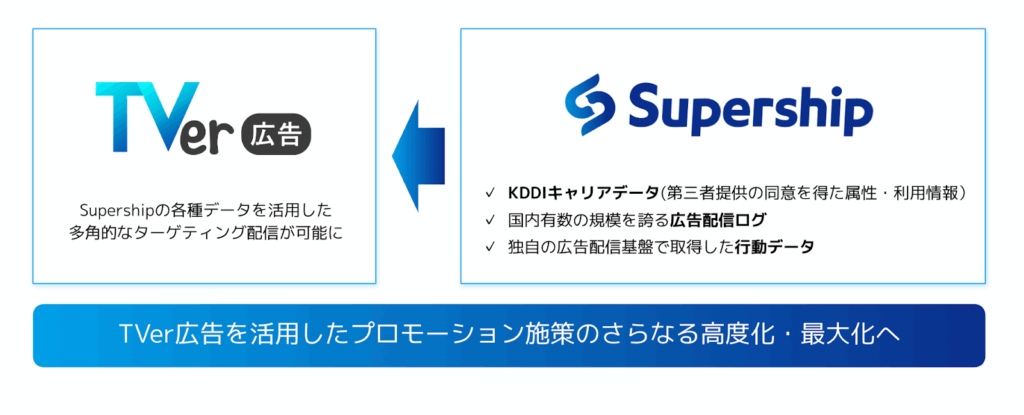 Supershipはこれまで、KDDIがユーザーから第三者提供の同意を得た属性・利用情報(キャリアデータ)に加え、国内有数の規模を誇る広告配信ログや独自の広告配信基盤で取得した行動データなどの多様なデータアセットを活用し、クライアント企業が自社では保有しにくい新たな層のデータをもとに、TVerをはじめとするプレミアムメディアでのデジタルマーケティングをプランニングから運用まで一貫して支援してきました。