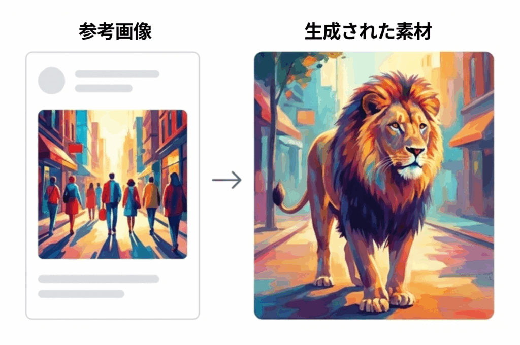 「自社のトンマナに合わせたいが、言葉(プロンプト)で指示するのが難しい」という課題に対し、参考画像をアップロードするだけで、AIがその画風や雰囲気(色味・構図)を反映した素材を生成する機能を搭載しました。 プロンプトエンジニアリングの知識がなくても、ブランドイメージに近い一貫性のあるクリエイティブを生成できます。