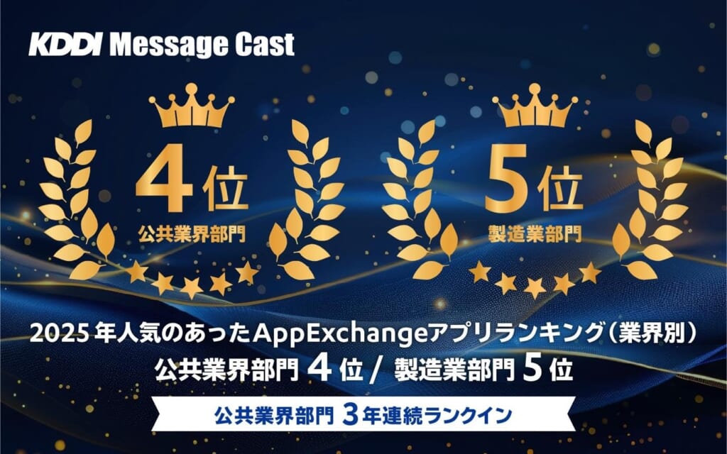 「2025年人気のあったAppExchange アプリランキング(業界別)」で「KDDI Message Cast for Salesforce」が公共業界部門の4位、製造業部門の5位に入賞/公共業界部門では3年連続ランクイン